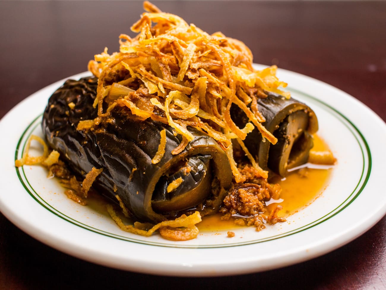 Delicioso arroz com lentilhas, molho de carne, coberto de cebola frita.