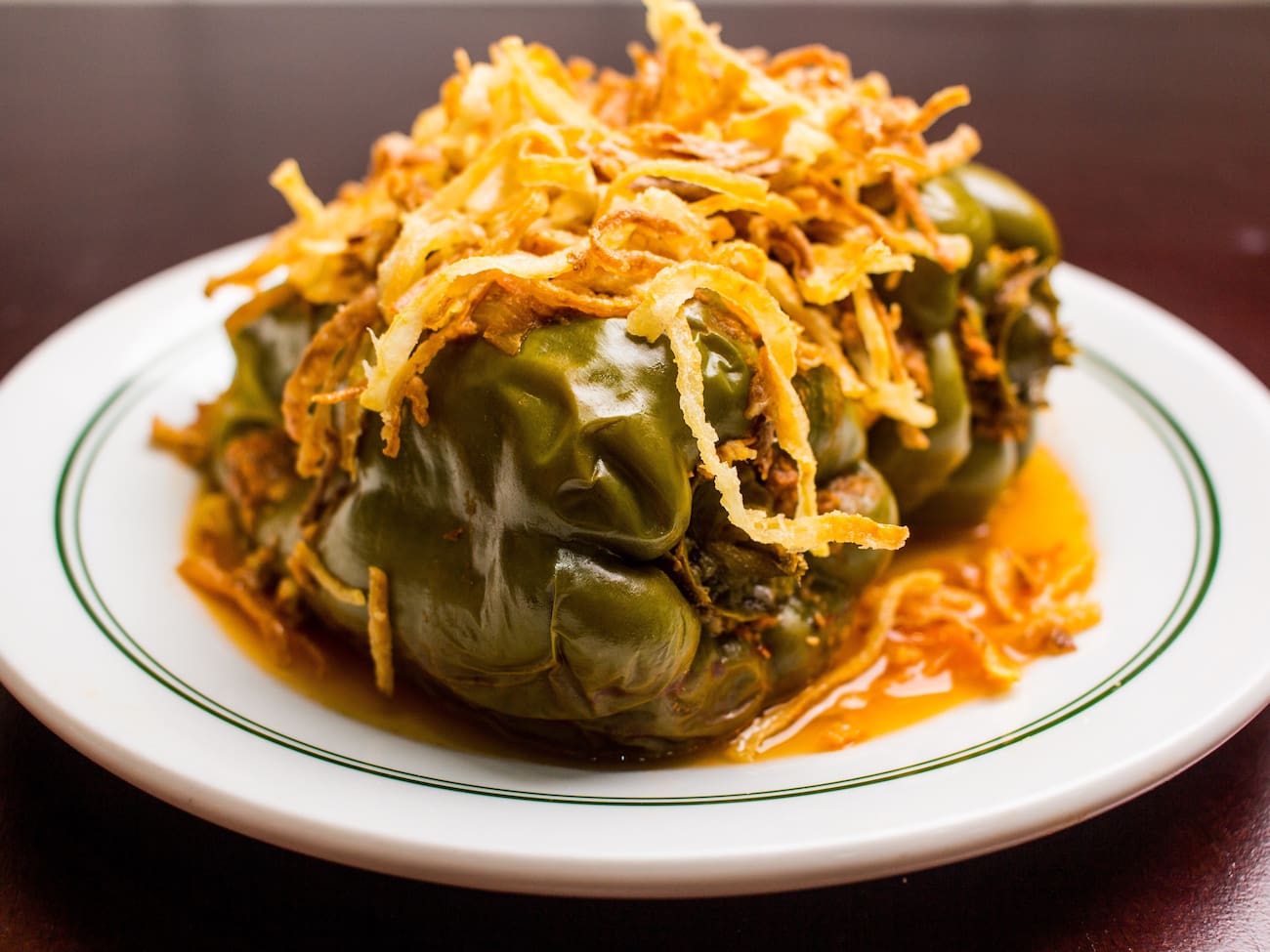 Delicioso arroz com lentilhas, molho de carne, coberto de cebola frita.