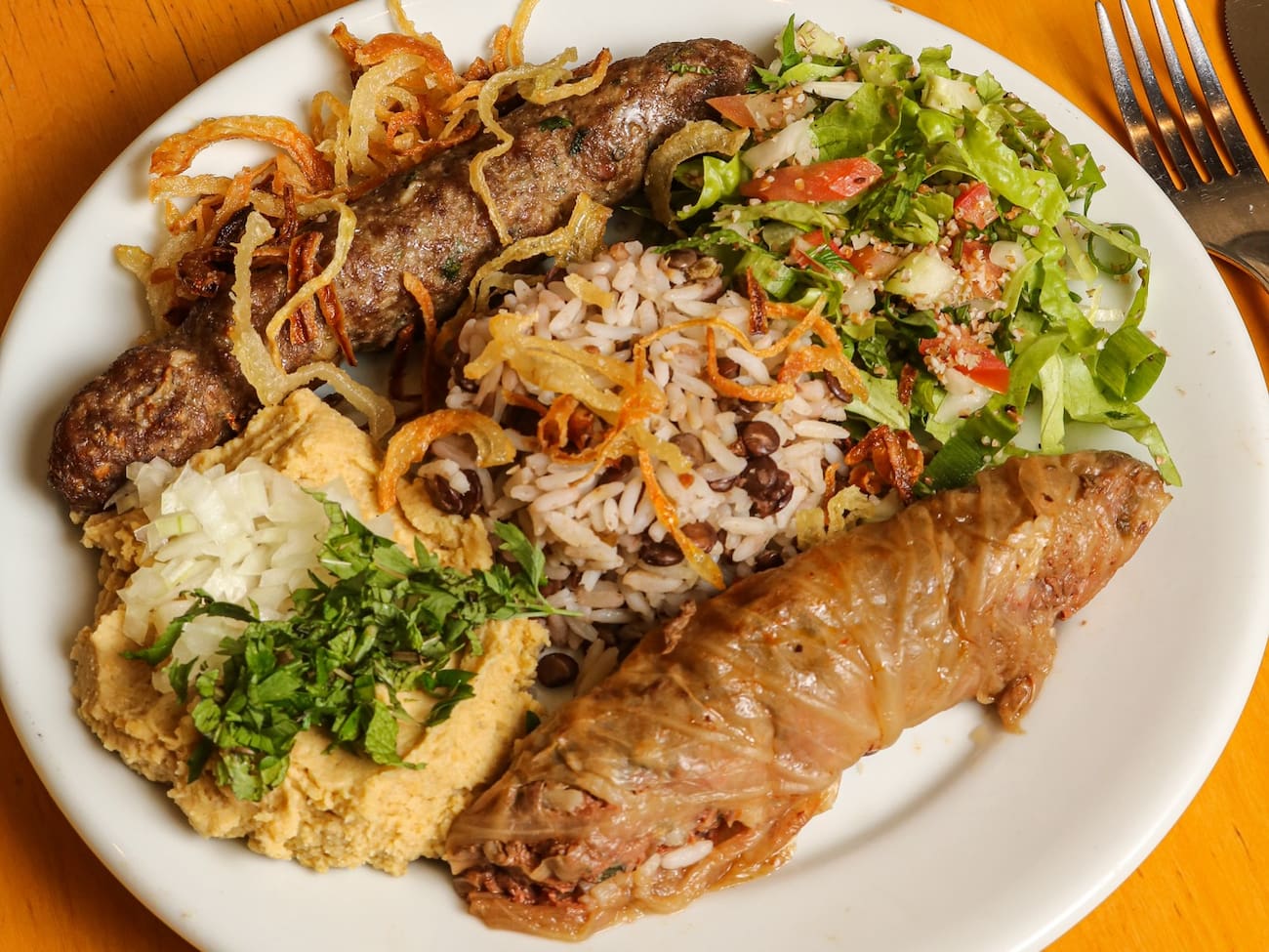 Arroz com lentilha, kafta, repolho recheado, tabule e homus