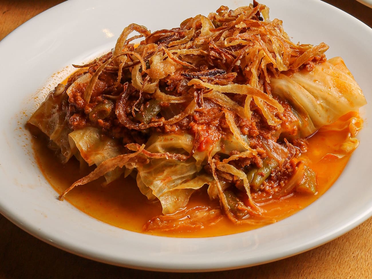 Meia porção de repolho recheado+ 2 kaftas no espeto (carne ou frango)